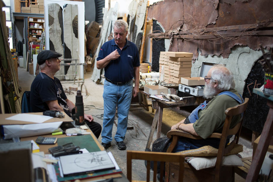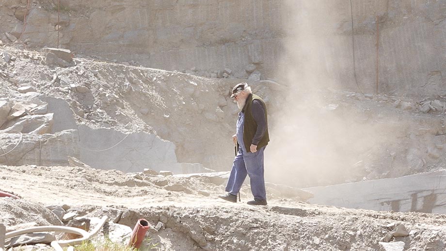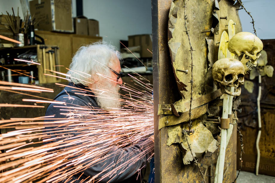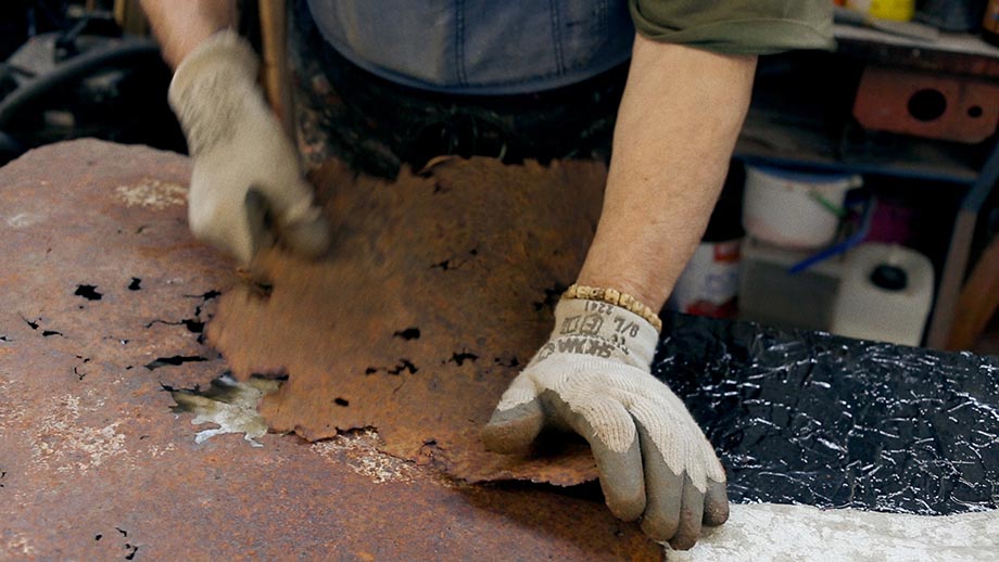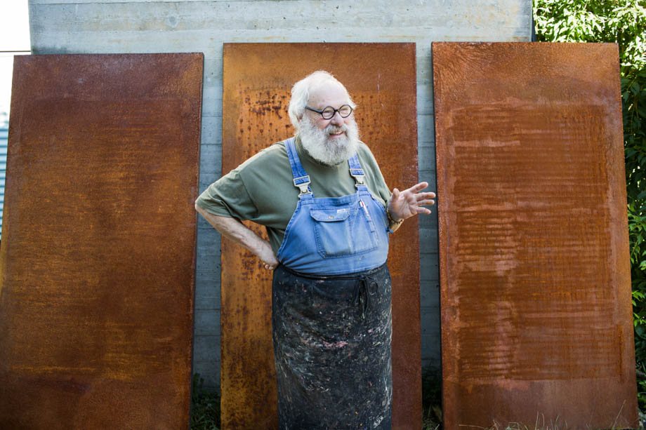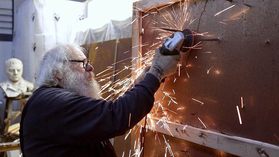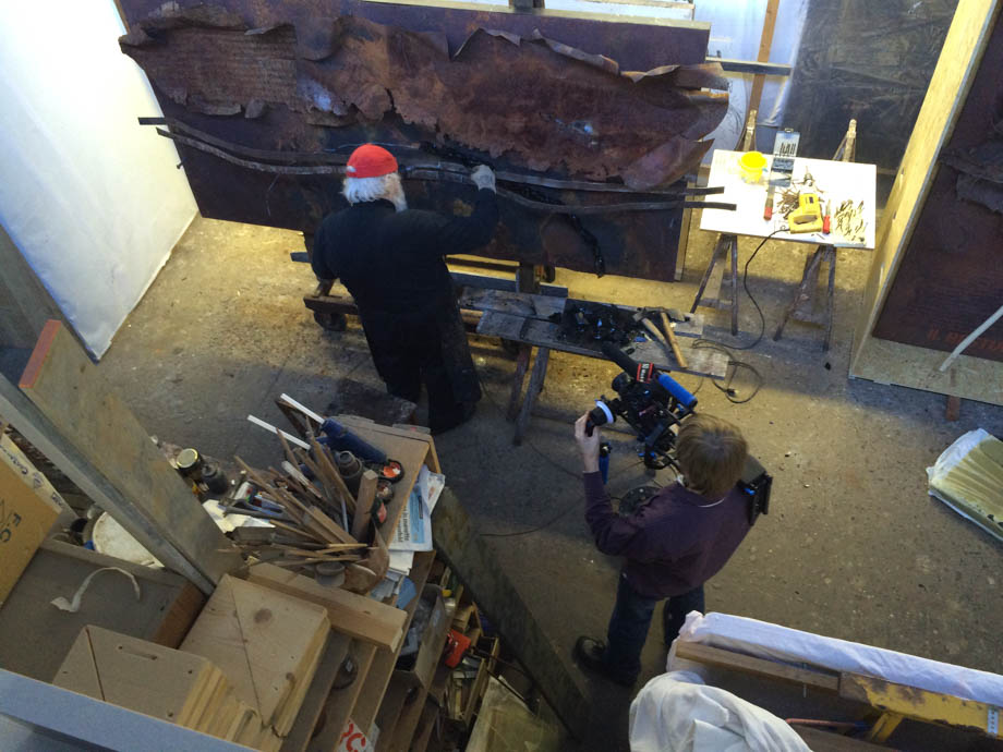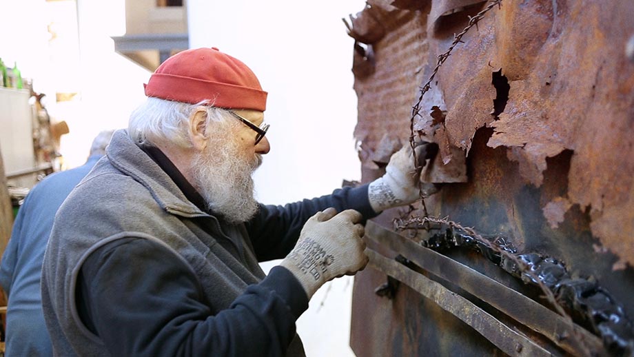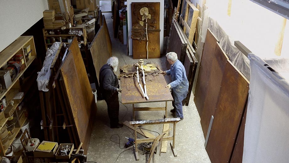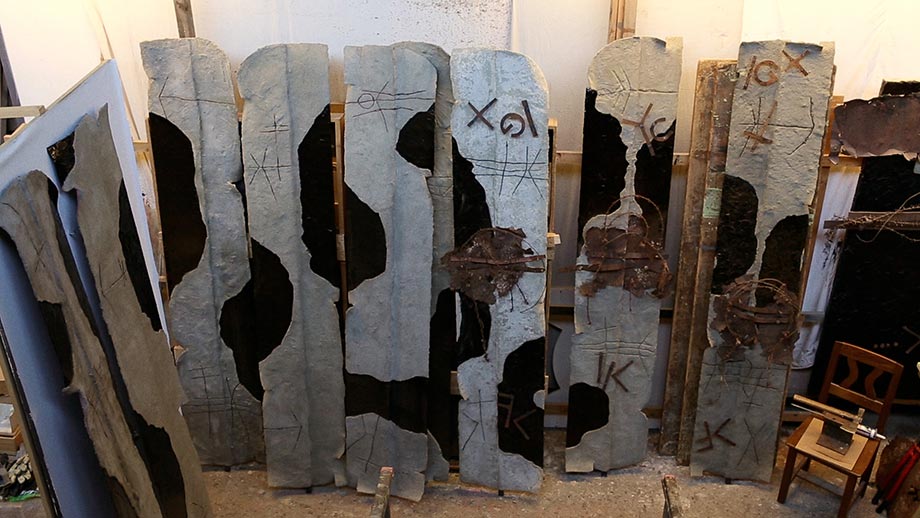 I Bianchi corrispondono anche al momento in cui è stato concesso alla nostra cinecamera di introdursi nell’atelier di Casè, nel luogo in cui l’artista-artigiano-alchimista trasforma la materia di cui dispone. Similmente ai suoi cugini dell’arte povera, si comporta più da costruttore di quadri che da pittore. Filo spinato arrugginito, chiodi forgiati a mano, catrame fumante, colla, intonaco, polvere colorata ottenuta con la sabbia, l’argilla, la ghiaia, lo gneiss e il granito della Vallemaggia, cera d’api, fuoco, cenere… Difficile non pensare alla fucina vulcanica di Efesto!