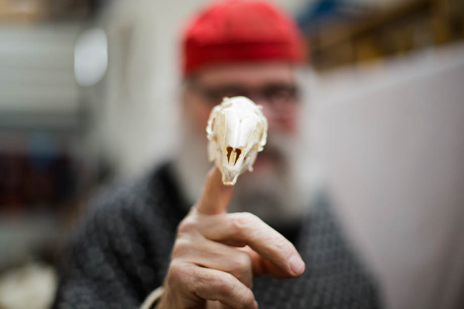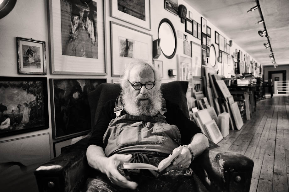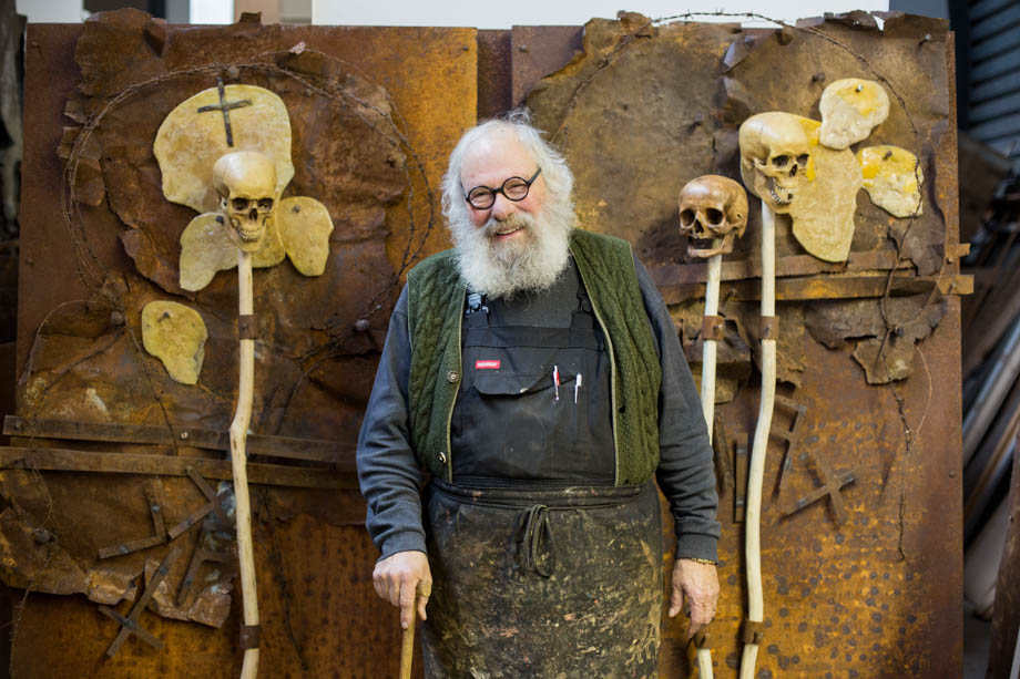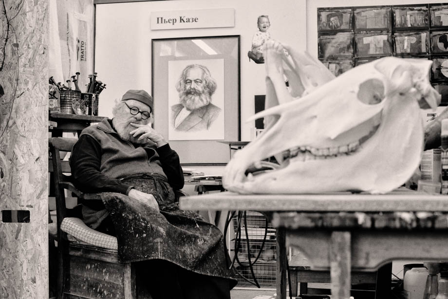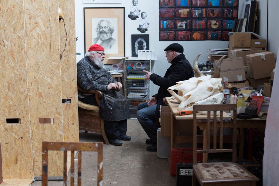 Ed è così che allo sciamano si uniscono gli animali guida, quelli che da tempi immemorabili aiutano, nutrono e accompagnano l’uomo. L’ultimo ciclo di Casè è infatti dedicato a un Bestiario valmaggese. Il cavallo, la vacca, il cane, la volpe, il gatto, il coniglio, il tasso, la capra, la pecora, il maiale… e l’uomo: tutti partecipanti di una danza macabra, un rituale in onore del patto, tanto pragmatico quanto mitico, che li lega. Abbiamo avuto la fortuna di capitare nel laboratorio del maestro durante la transizione dalla fase bianca, che segna il compimento di un primo cinquantennio di lavoro artistico, alla fase matura e in qualche modo picaresca di un bestiario pseudo-medievale, cui l’opera poetica del fratello Angelo fa da pendant.