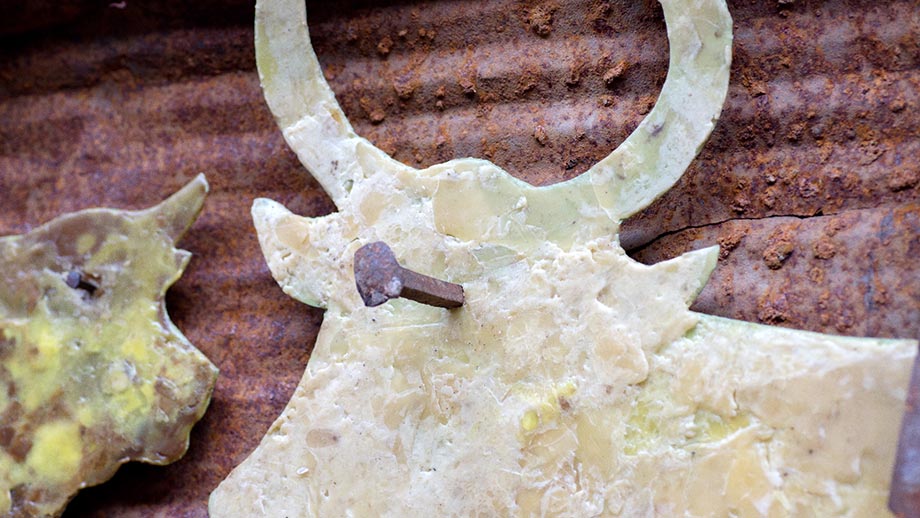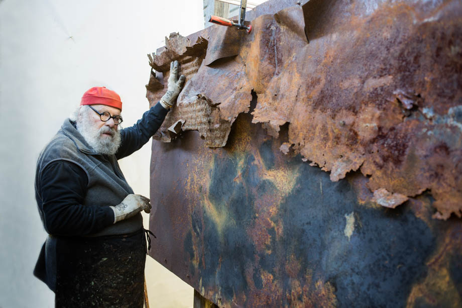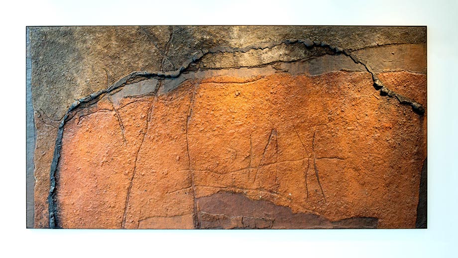 Atmosfere arcaiche: uno scontro dialettico con il paesaggio che circonda l’artista, una conflagrazione di materia, forma, ingegno e anima fino ai livelli più sensibili di percezione, sostanza creatrice di un’intensità evocativa pari a quella della pittura rupestre preistorica.